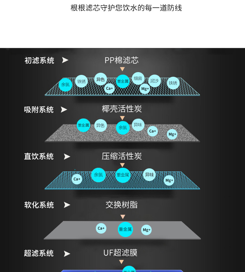 過濾系統(tǒng):初濾系統(tǒng)+吸附系統(tǒng)+直飲系統(tǒng)+超濾系統(tǒng)+能量系統(tǒng)+口感系統(tǒng)