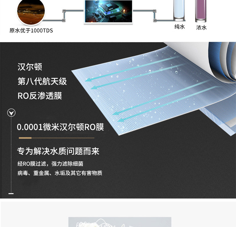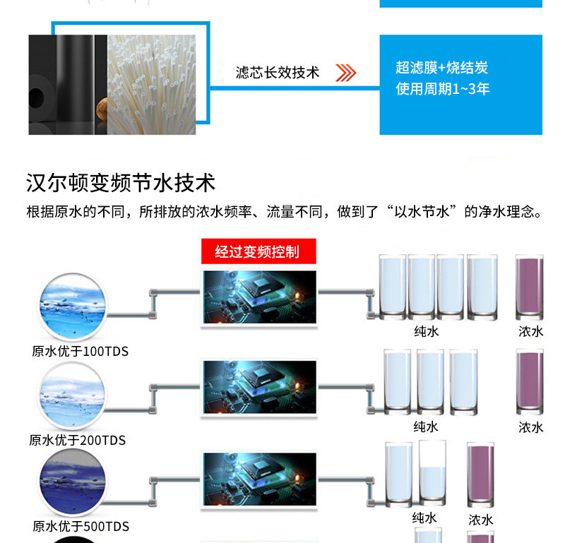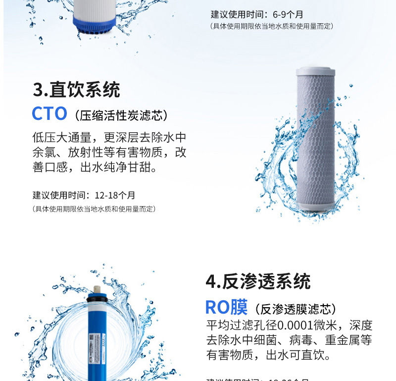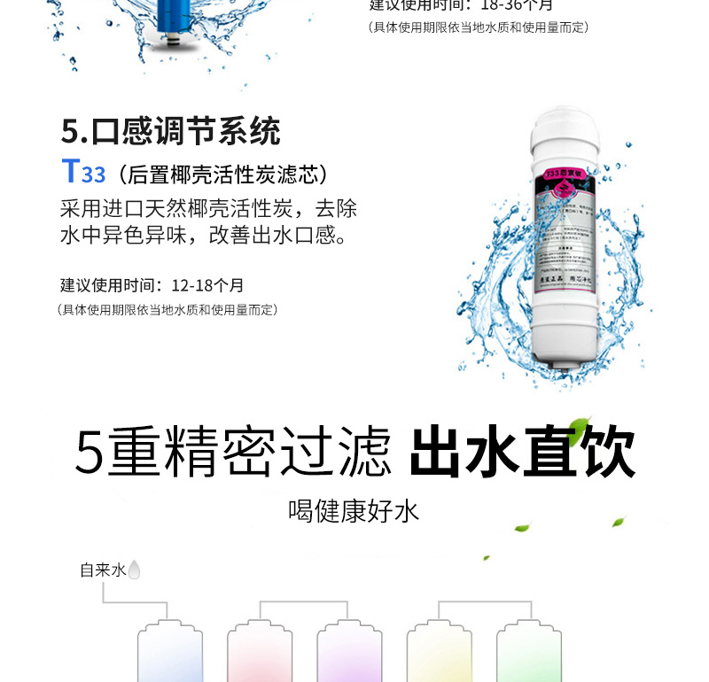 過濾系統(tǒng):初濾系統(tǒng)+吸附系統(tǒng)+直飲系統(tǒng)+反滲透系統(tǒng)+口感系統(tǒng)