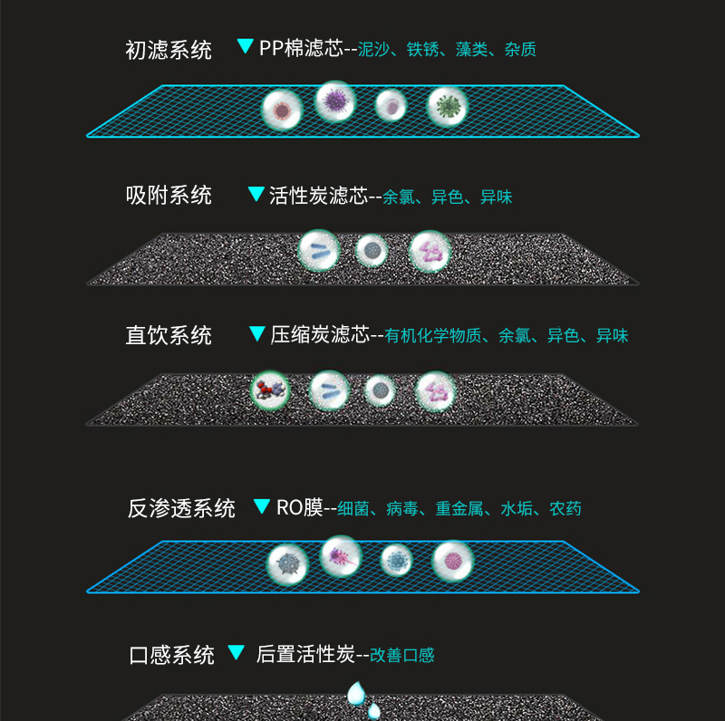 過濾工藝:初濾系統(tǒng)+吸附系統(tǒng)+直飲系統(tǒng)+反滲透系統(tǒng)+口感調(diào)節(jié)系統(tǒng)