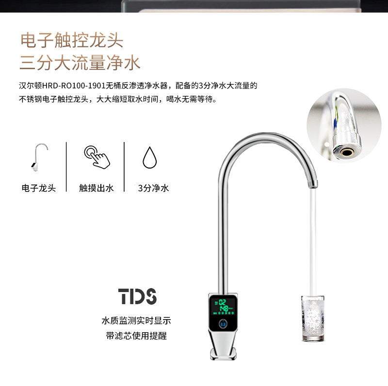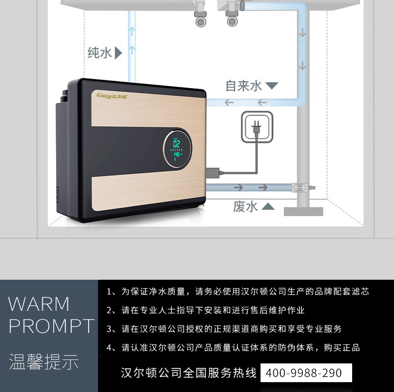 配置:漢爾頓進(jìn)口高配,美國進(jìn)口吸附濾芯、進(jìn)口RO膜、觸控智能水龍頭、銅芯不銹鋼三通球閥.
