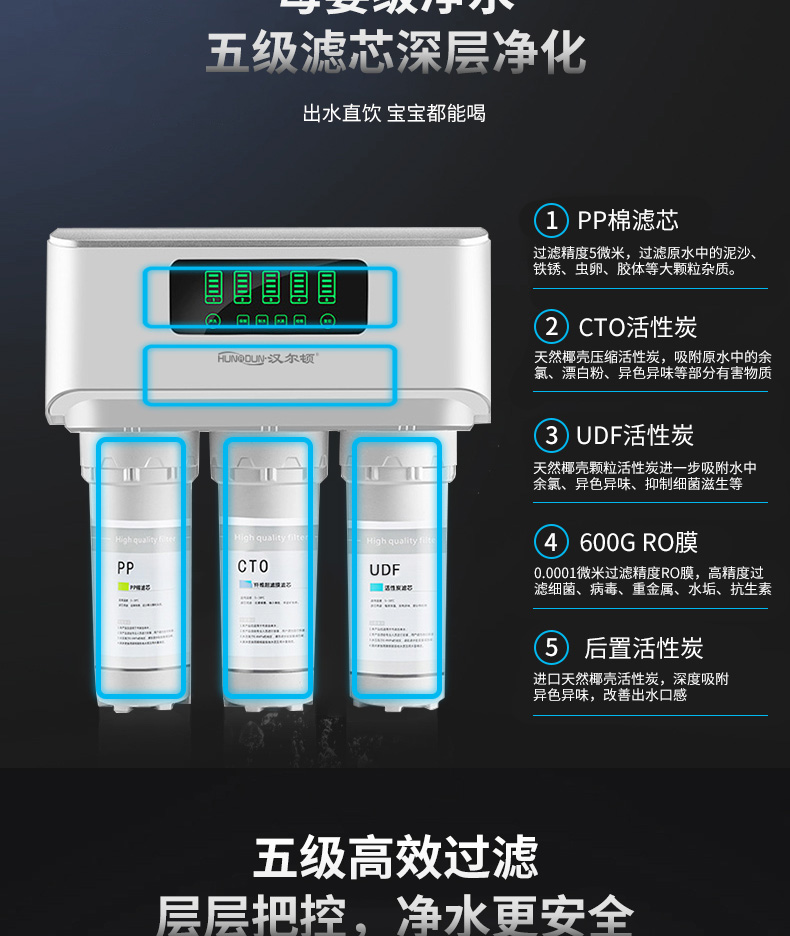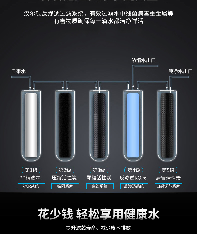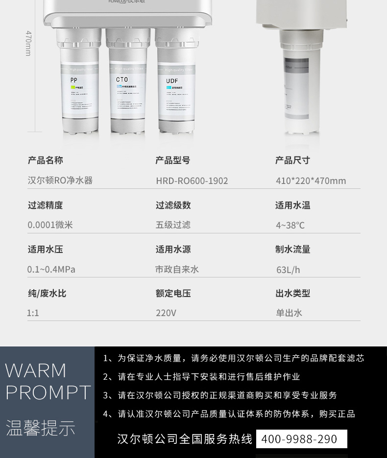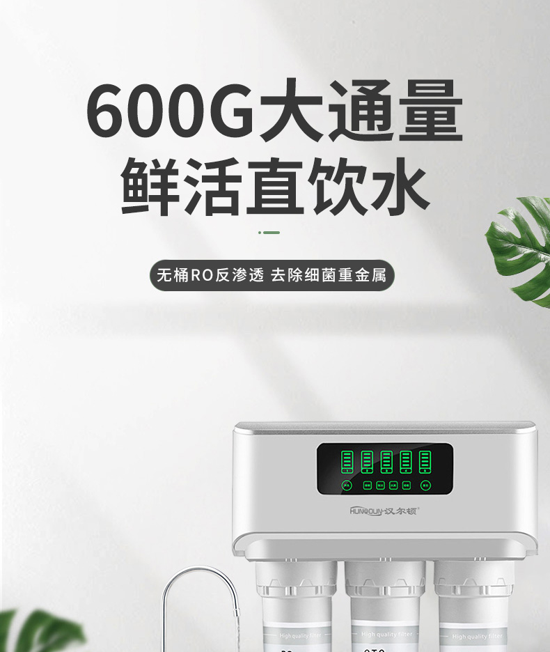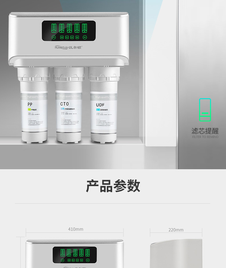 配置:漢爾頓進(jìn)口高配,美國進(jìn)口吸附濾芯、進(jìn)口RO膜、304純不銹鋼拉絲美式3分大彎龍頭、臺(tái)灣CCK牌PE水管、銅芯不銹鋼三通球閥。