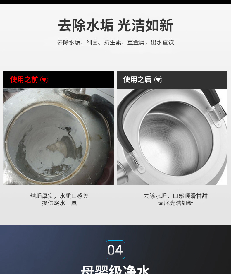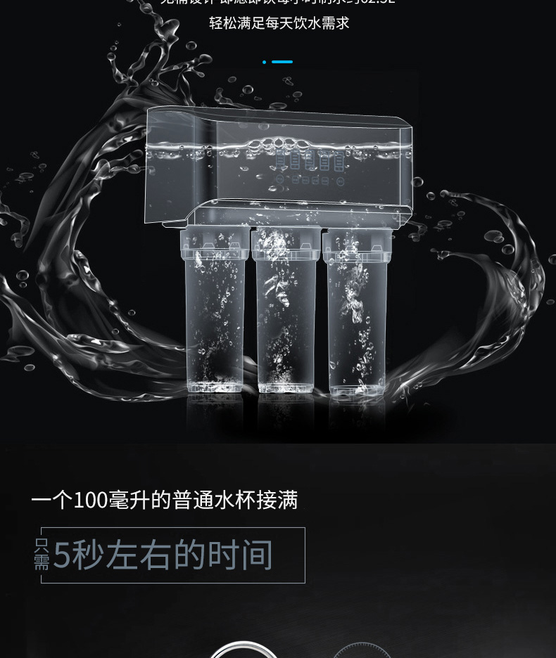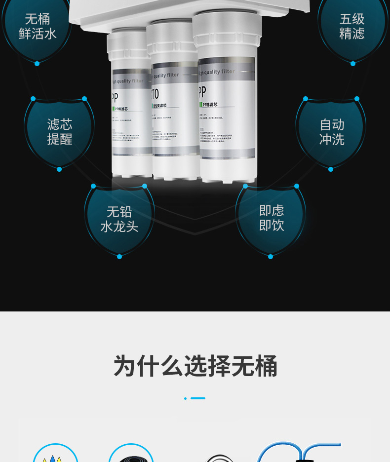 過濾工藝:初濾系統(tǒng)+吸附系統(tǒng)+直飲系統(tǒng)+反滲透系統(tǒng)+口感調(diào)節(jié)系統(tǒng)