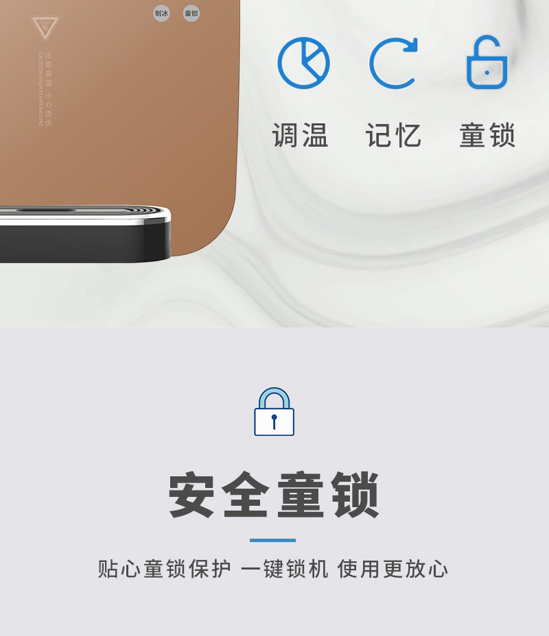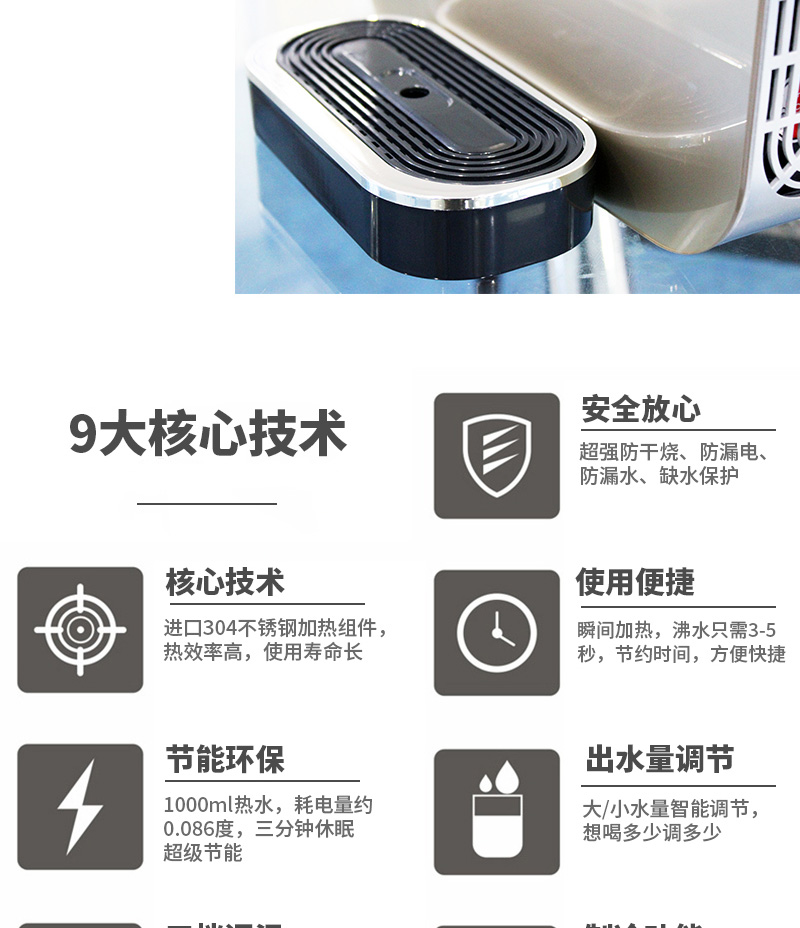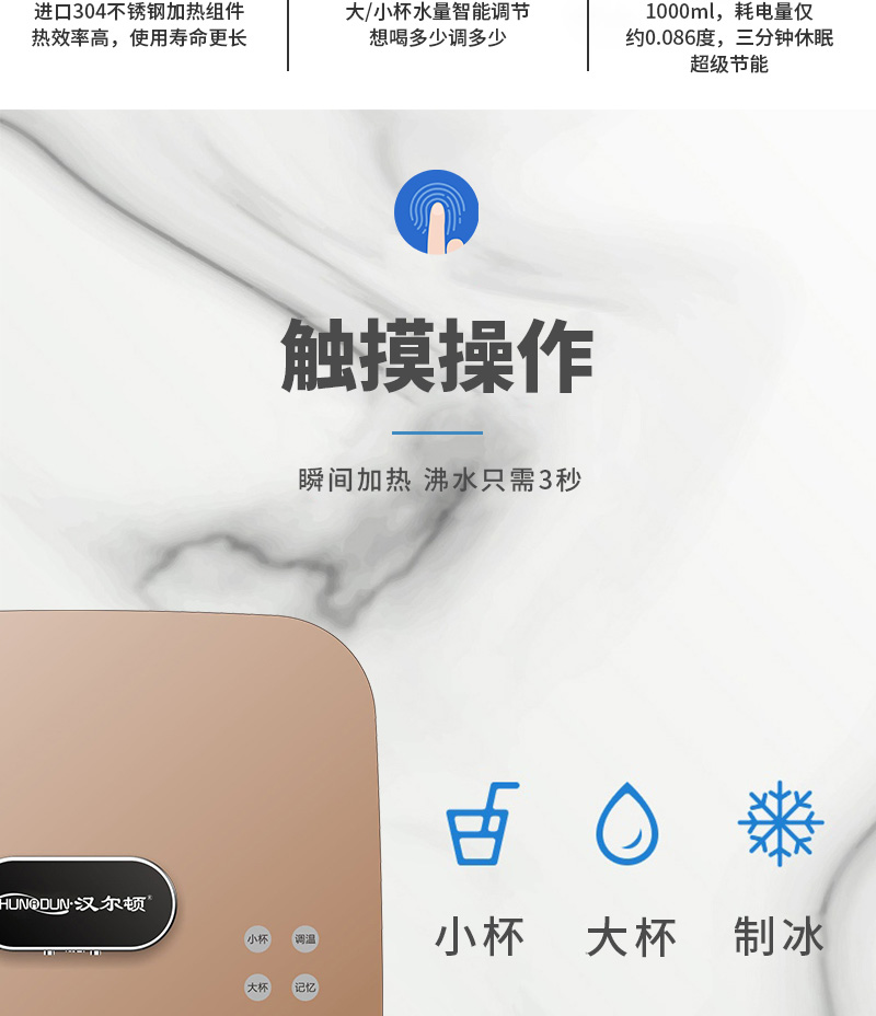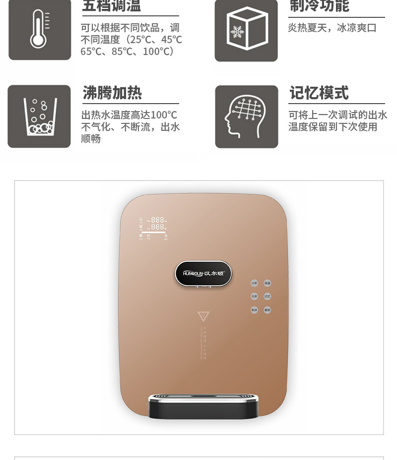 無內膽3秒即熱5檔溫度 NVH超靜音設計 無人值守定量出水超薄機身 超大液晶顯示屏 鋼化玻璃面板觸摸按鍵