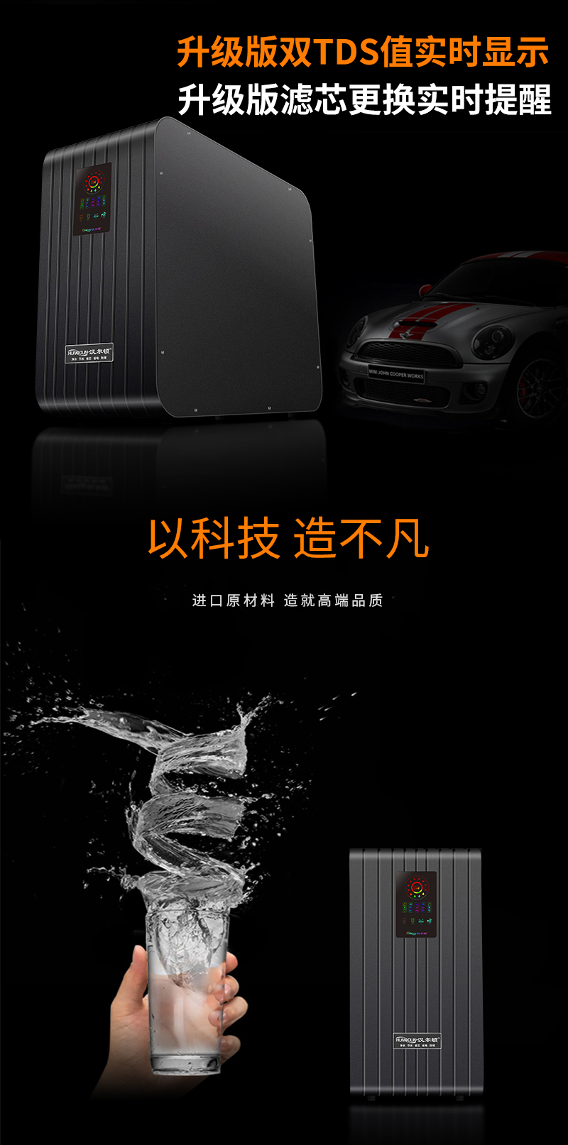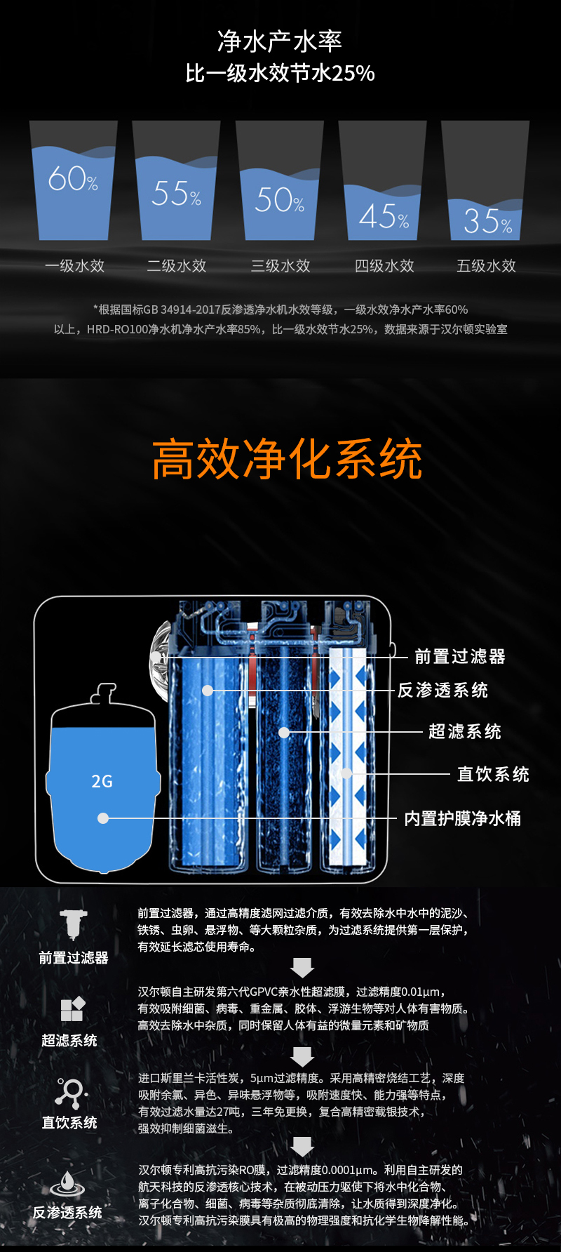 過濾系統(tǒng):前置過濾+超濾系統(tǒng)+直飲系統(tǒng)+反滲透系統(tǒng)