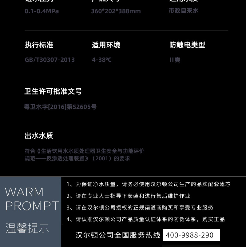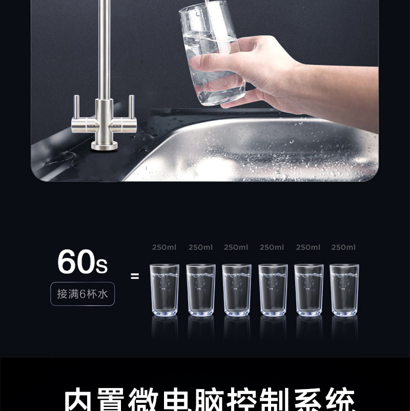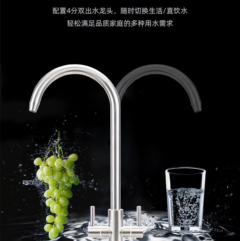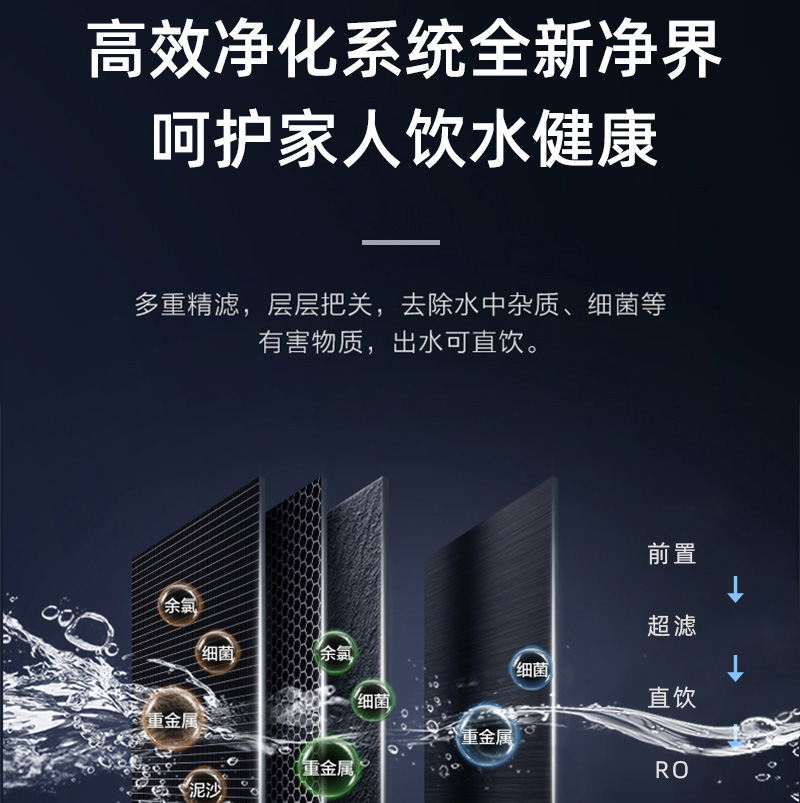 過濾系統(tǒng):前置過濾+超系統(tǒng)+直飲系統(tǒng)+反滲透系統(tǒng)