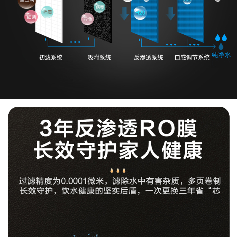 結(jié)構(gòu):豪華一體外殼,獨立研發(fā)自主微控系統(tǒng),自動變頻調(diào)節(jié),自帶數(shù)字多功能顯示 過濾工藝:初濾系統(tǒng)+直飲系統(tǒng)+反滲透系統(tǒng)+口感調(diào)節(jié)系統(tǒng)