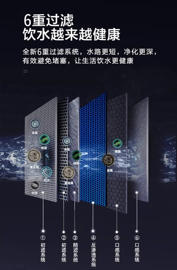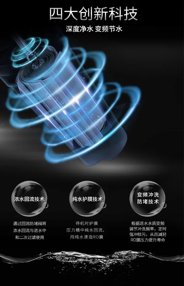 它擁有四大創(chuàng)新科技:1.深度凈水 變頻節(jié)水;2.濃水回流技術(shù);3.純水護(hù)膜技術(shù);4.變頻沖洗防堵技術(shù)。六重過(guò)濾技術(shù),為您和家人飲用水保駕護(hù)航!